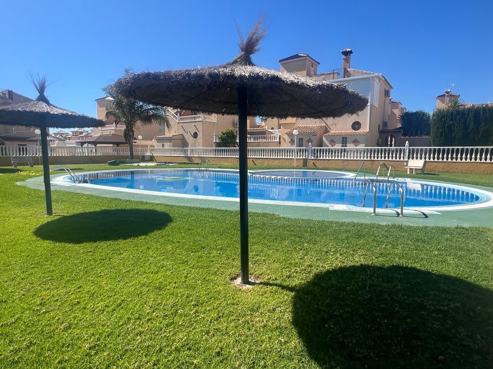 Casa en Cabo Roig, con 88 m² construidos, 76 m² útiles, 126 m² metros de parcela, 84 metros de jardín, 3 dormitorios, 2 baños, buen estado, 1 terraza(s), cocina amueblada, orientación sur, zonas verdes, piscina comunitaria, 3 plantas del edificio, suelo de gres